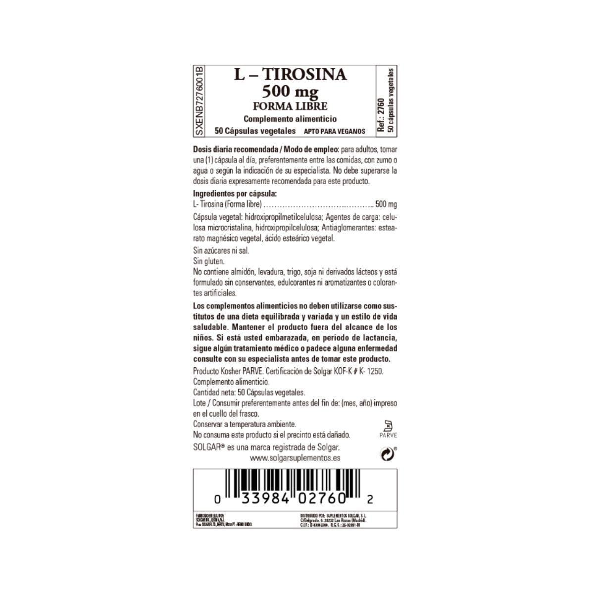 - Solgar® L-Tirosina 500 mg Cápsulas vegetales se presenta en una dosis de 1 cápsula al día en una formulación vegetal de fácil absorción.