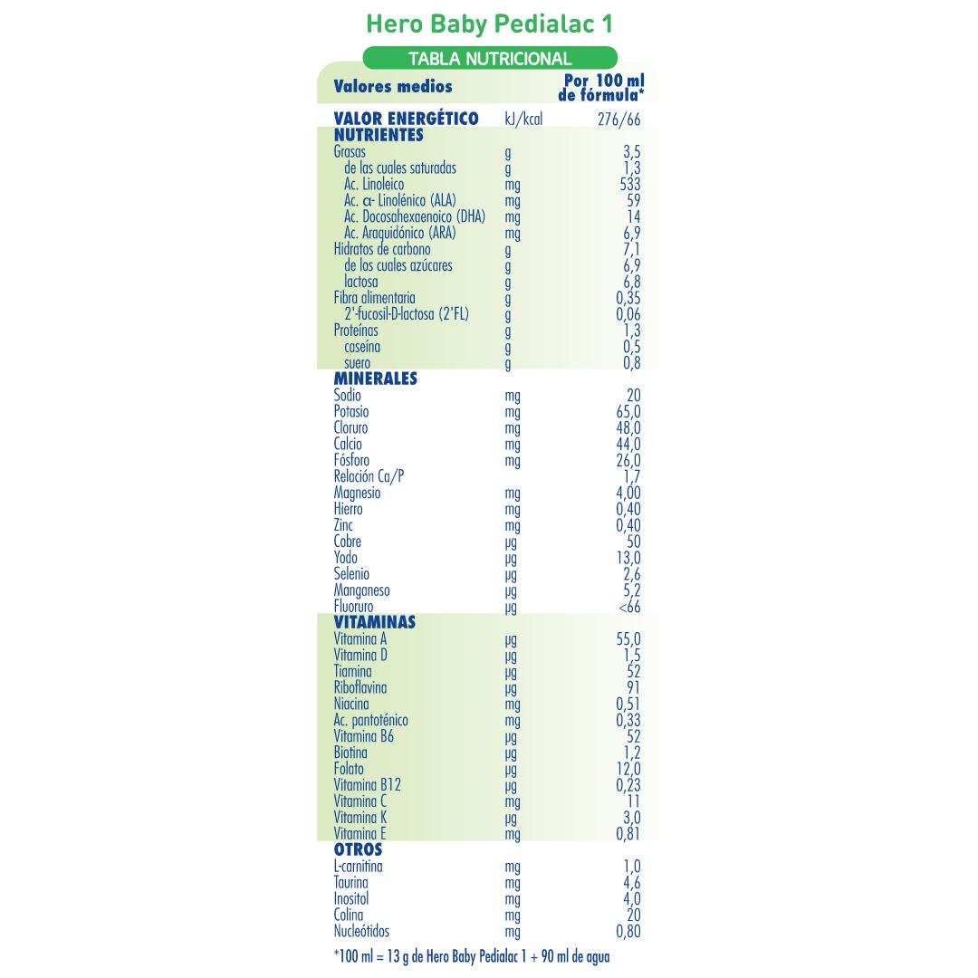 La leche infantil de inicio 1 Pedialac de Hero Baby aporta los ingredientes necesarios para el óptimo desarrollo de tu bebé, destacando sus lípidos lácteos, DHA, ARA, GOS y nucleótidos, todos ellos presentes naturalmente en la leche materna. Indicada a partir de su nacimiento.