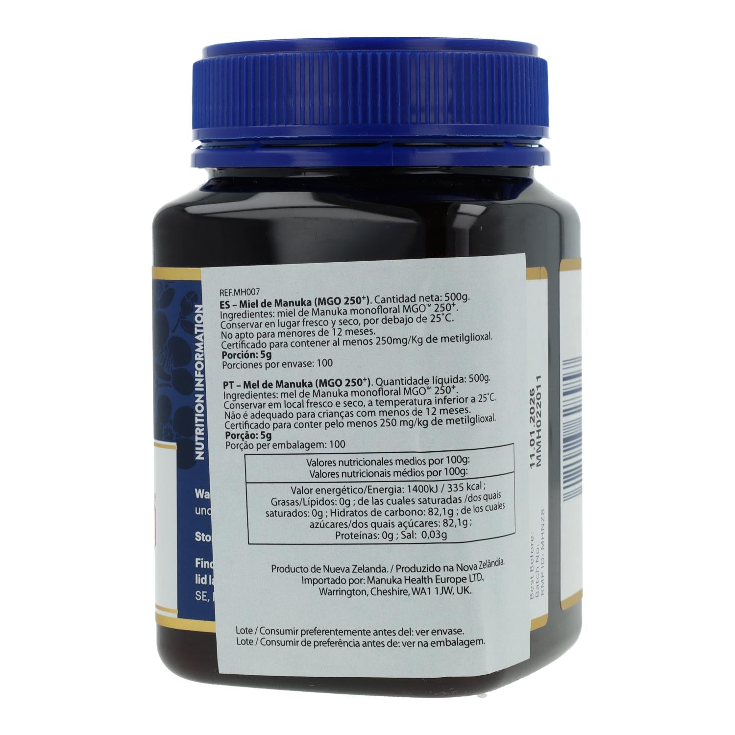 Ingredientes: Miel de Manuka monofloral MGOTM 250+. Certificado para contener al menos 250mg/Kg de metilglioxal.