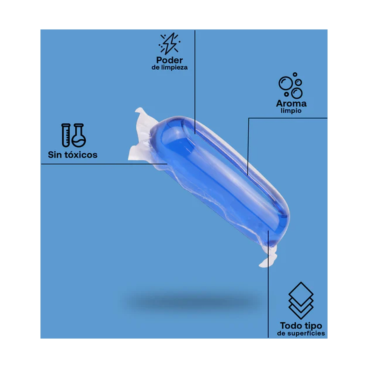No abrir, cortar ni perforar la cápsula. No tocar las cápsulas con las manos mojadas (se deshacen en contacto con el agua). Guardar en un lugar seguro, fuera del alcance de los niños.
