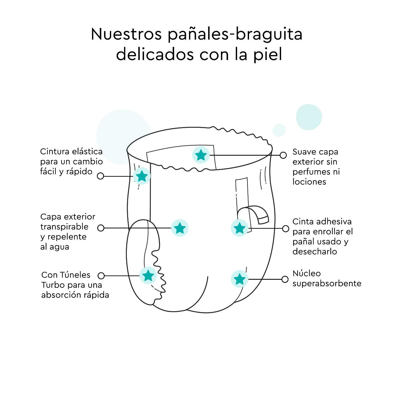 - Talla 6 recomendada para bebés de 15+ kg. El paquete contiene 95 pañales-braguita.