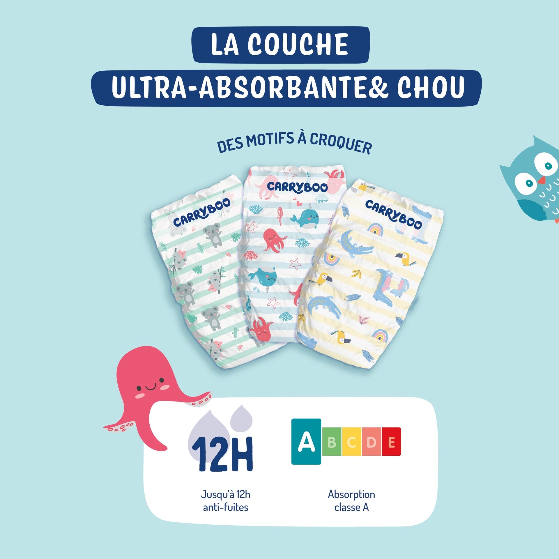 Pañales sanos para el bebé... Los pañales Carryboo Nature están fabricados con un vellón 100% natural y están garantizados sin cloro, sin perfume, sin loción, sin petrolato y sin OGM. Para un culito seco en el que puedes confiar. Y como la confianza no excluye el control, nuestros productos son analizados por laboratorios independientes para certificar la ausencia de más de 200 sustancias nocivas. Y todo ello, ¡manteniéndose seco hasta 12 horas, día y noche!