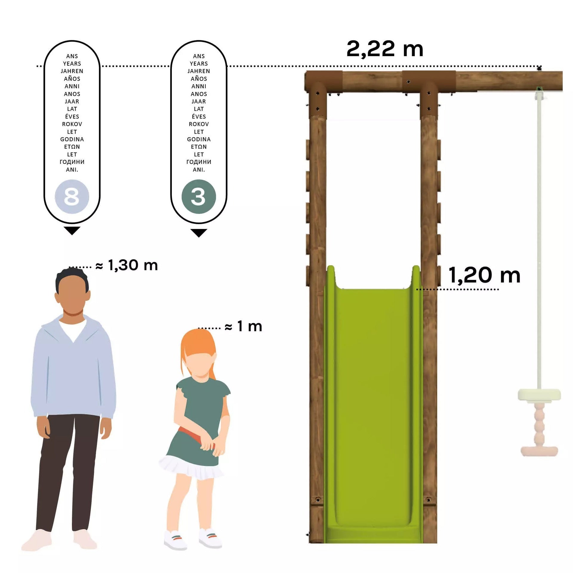 ¡Con la estación de madera Tulipe, todos los niños son bienvenidos al jardín para divertirse! Los niños de 3 a 12 años podrán disfrutar del columpio, el cara a cara y el tobogán. Y los más pequeños, de 6 a 24 meses, tendrán un asiento de bebé exclusivo para ellos. La estación admite hasta cinco niños .