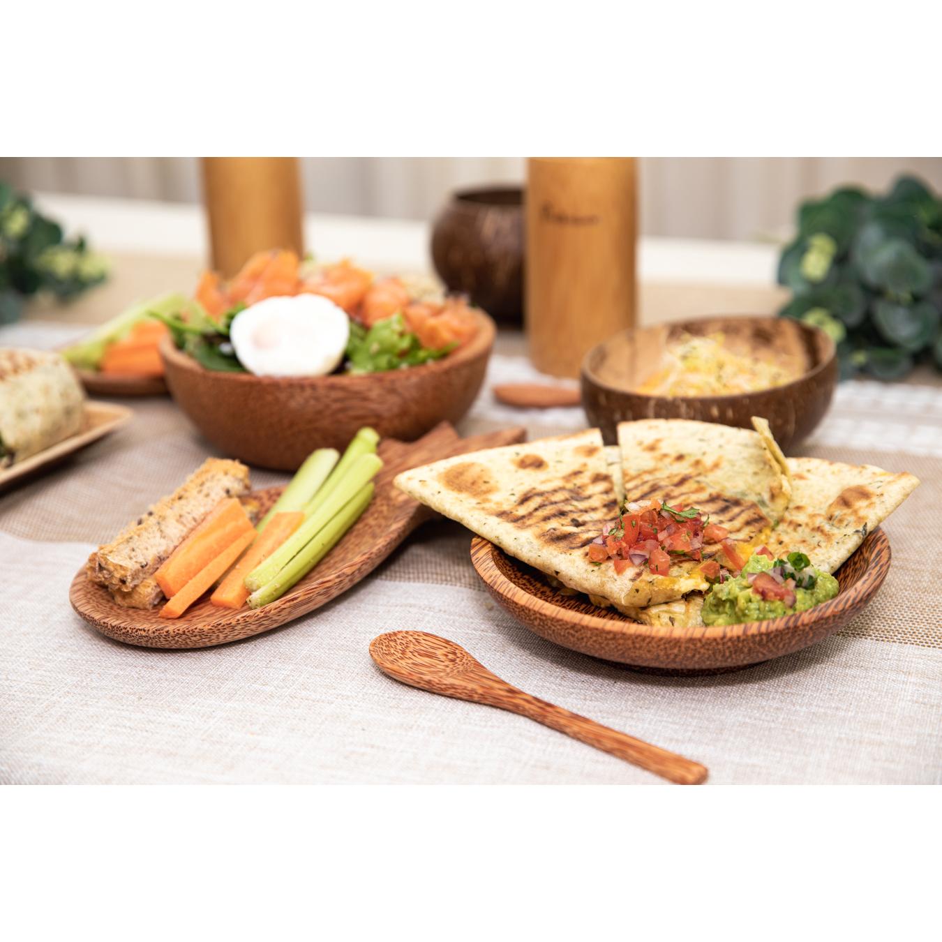 Descubre nuestra nueva vajilla reutilizable de madera de coco donde podrás servir cualquier plato con una estética natural y sofisticada. Platos ecológicos resistentes y duraderos. Puedes lavarlos en el lavavajillas aunque al estar fabricado a partir de un material natural es recomendable el lavado a mano.