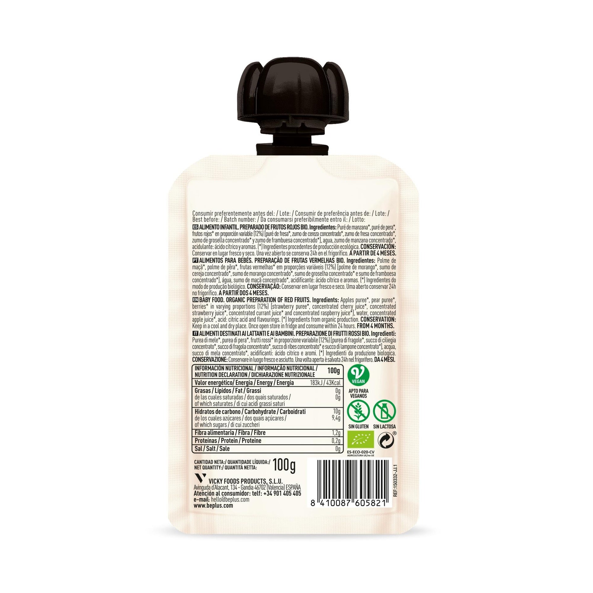 Puré de manzana *, puré de pera *, frutos rojos * en proporción variable (12%) [puré de fresa *, zumo de cereza concentrado *, zumo de fresa concentrado *, zumo de grosella concentrado * y zumo de frambuesa concentrado *], agua, zumo de manzana concentrado *, acidulante: ácido cítrico y aromas. (*) Ingredientes procedentes de producción ecológica.