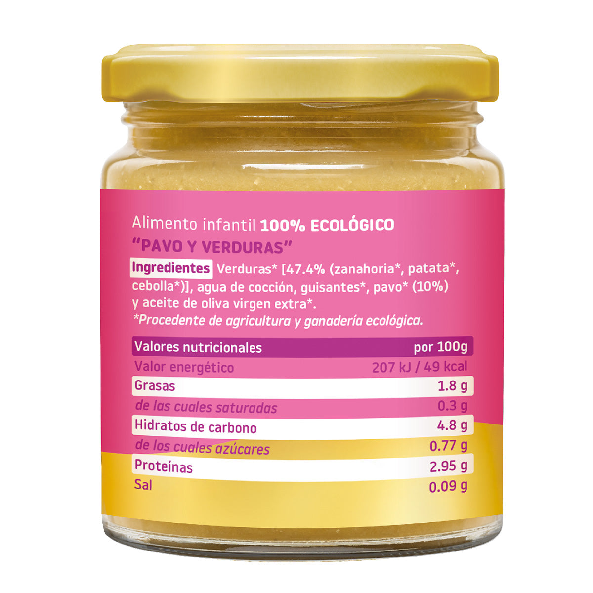Verduras* [47,4% (zanahoria*, patata*, cebolla*)], agua de cocción, guisantes*, pavo* (10%) y aceite de oliva virgen extra*. *Procedente de agricultura y ganadería ecológica.