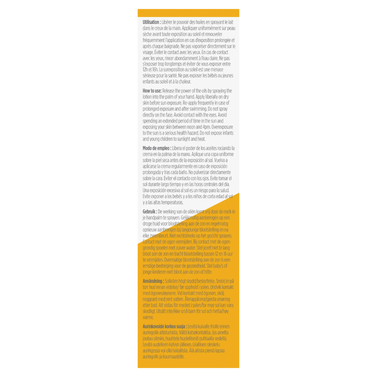 Aplicar uniformemente sobre la piel seca antes de la exposición al sol y repetir frecuentemente en caso de exposición prolongada y después de cada baño.