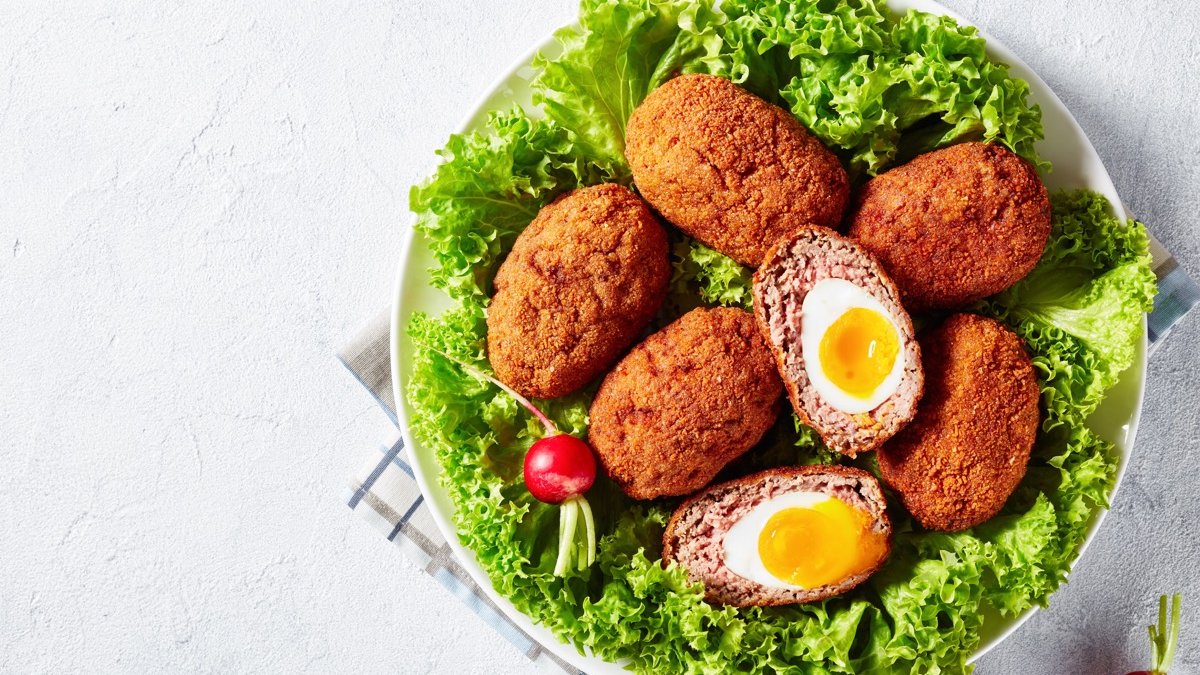 - Cubre los huevos cocidos uniformemente con harina. Toma la mitad de la mezcla de carne y forma una capa uniforme alrededor de un huevo cocido. Sumerge en huevo batido, luego rebózalo en pan rallado hasta cubrirlo completamente. Repite cada paso con el otro huevo.