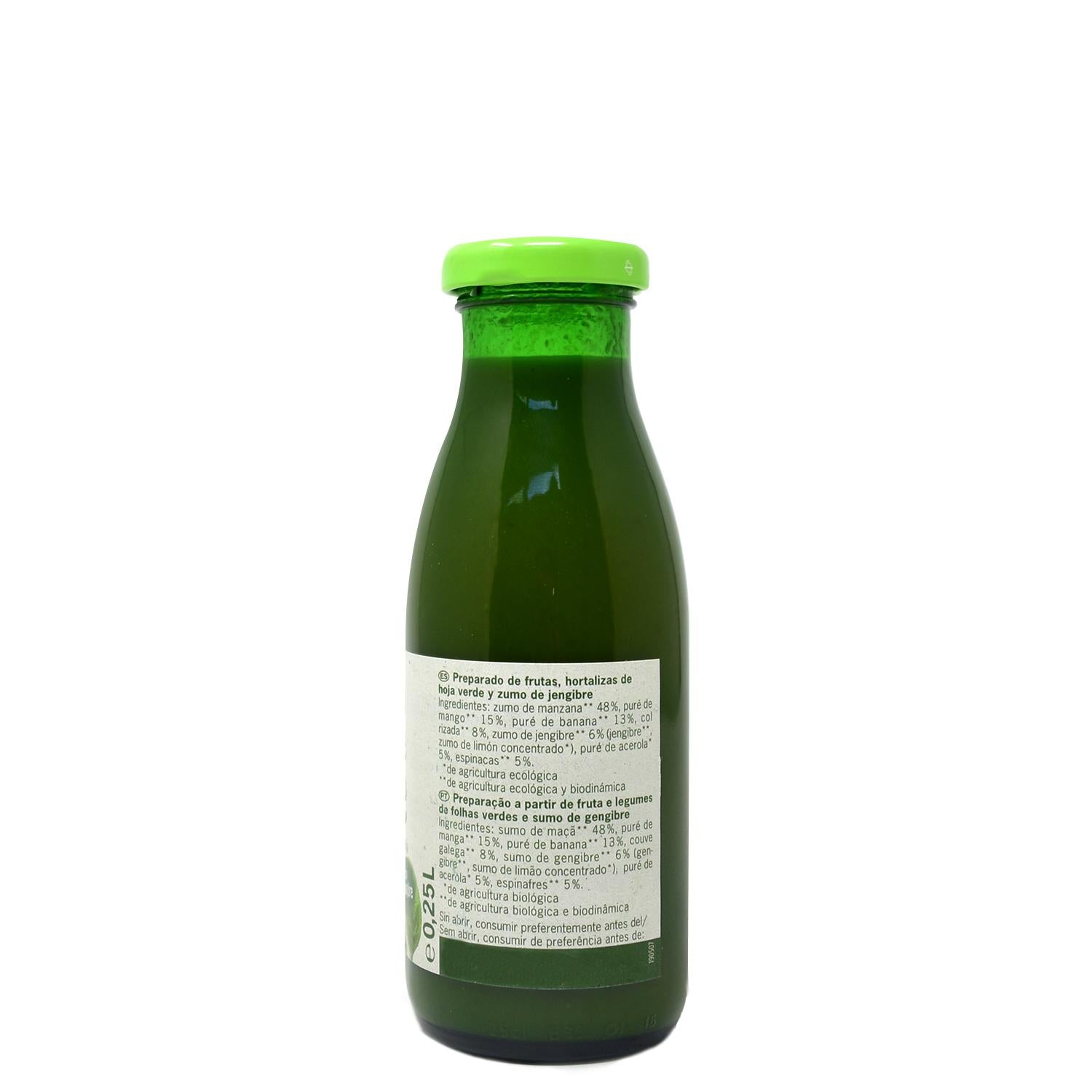 zumo de manzana*, puré de mango* 15%, puré de banana*, col rizada* 8%, zumo de jengibre* 6% (jengibre*, agua mineral natural, concentrado de zumo de limón*), puré de cereza acerola*, espinaca* 5%