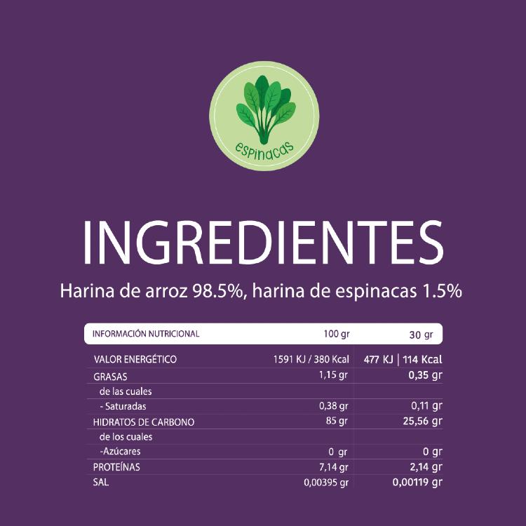 - Harina de arroz orgánico 98,5%, harina de espinacas orgánicas 1,5%.
