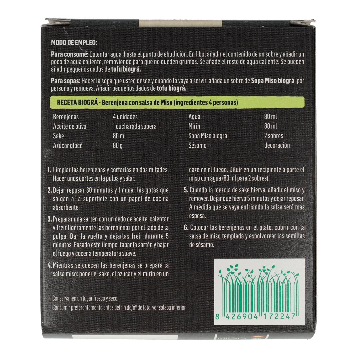 Hacer la sopa que usted desee y cuando la vaya a servir, añada un sobre de Sopa Miso biográ, por persona y remueva. Añadir pequeños dados de tofu biográ.