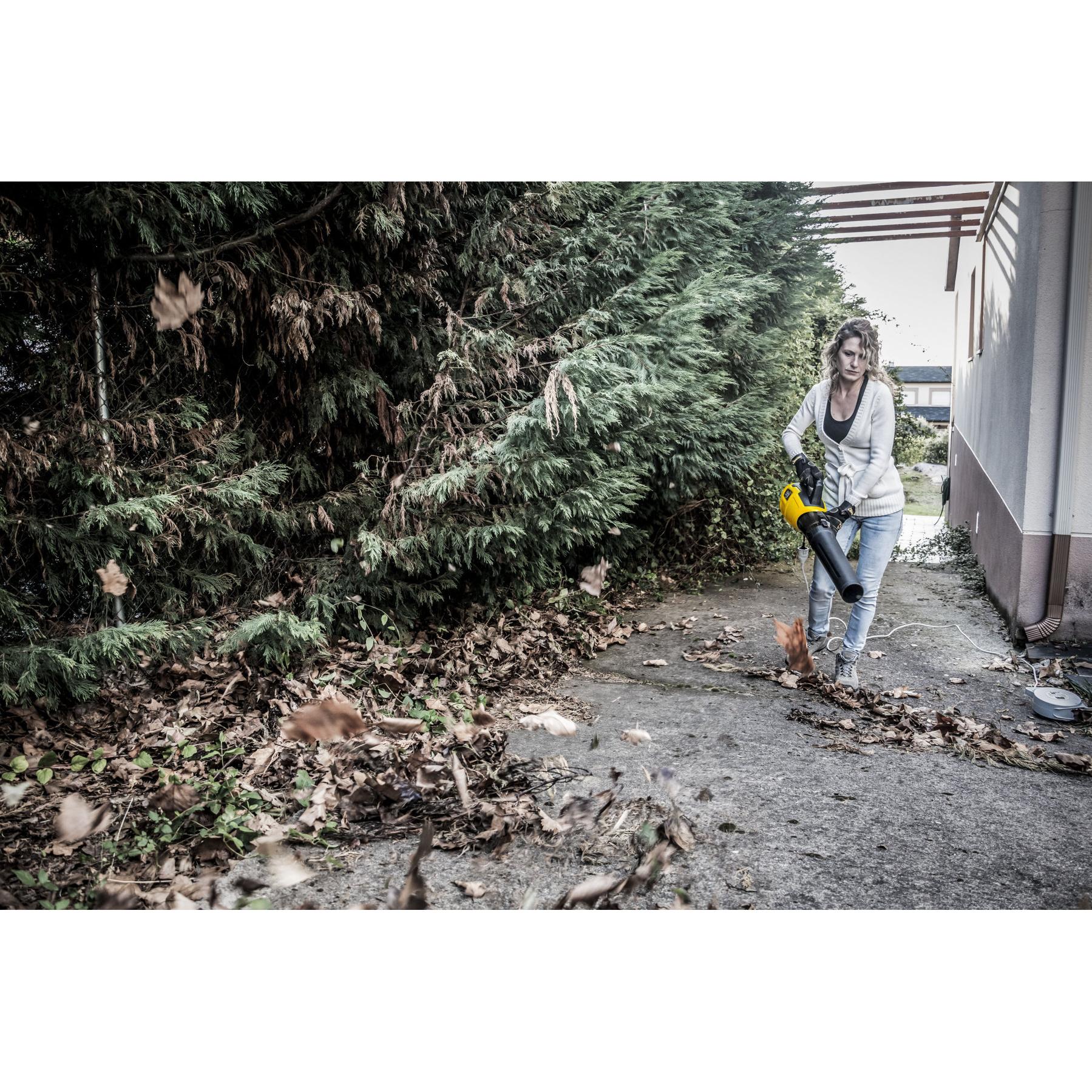 Soplador eléctrico ligero y eficiente, perfecto para la limpieza de hojas secas, césped cortado y suciedad ligera en jardines, patios o terrazas.