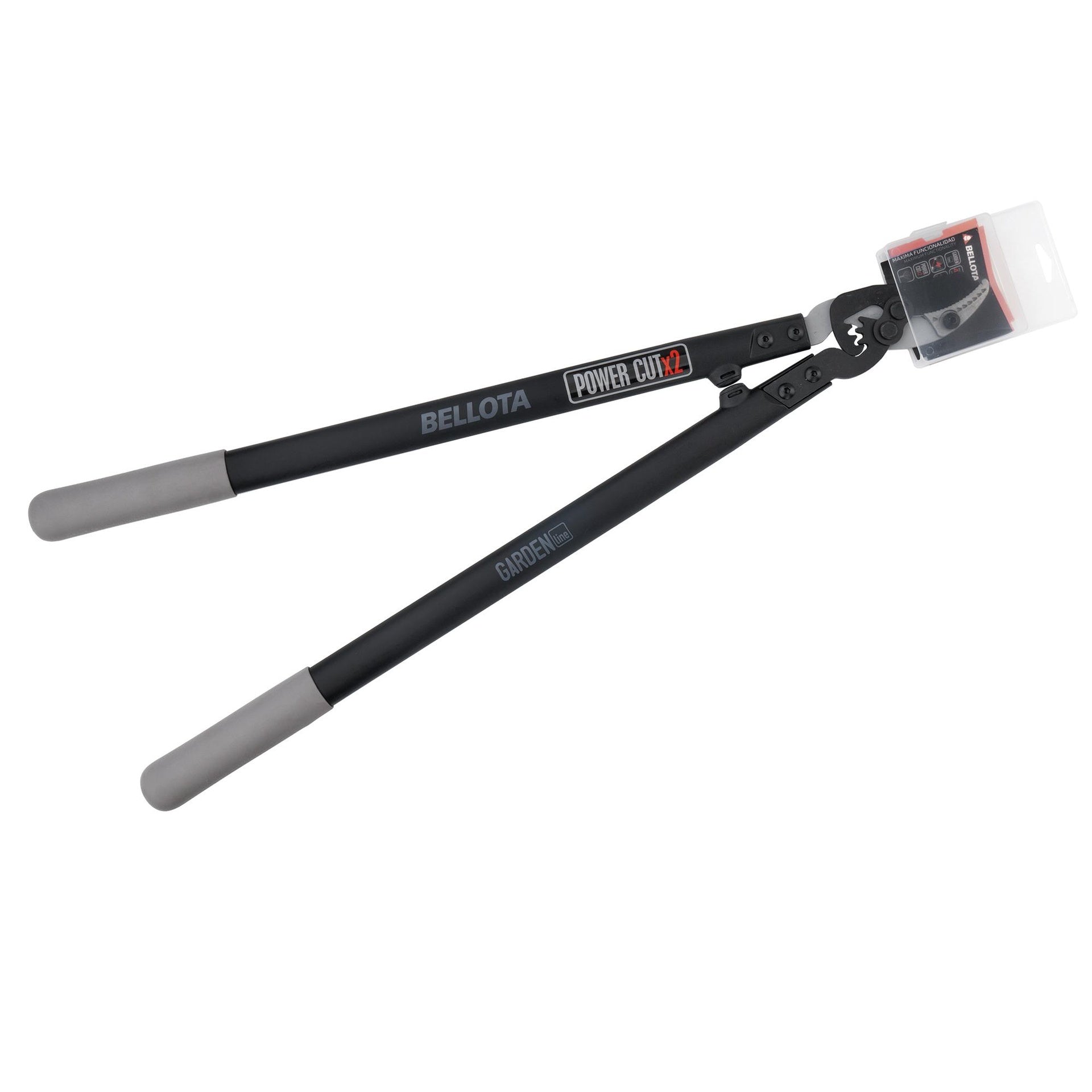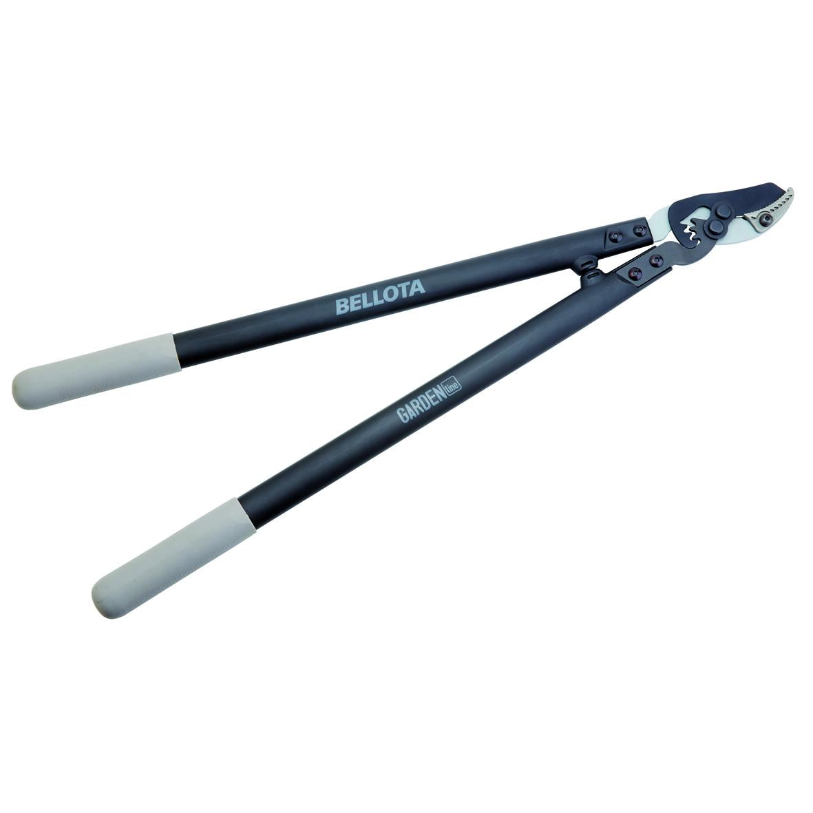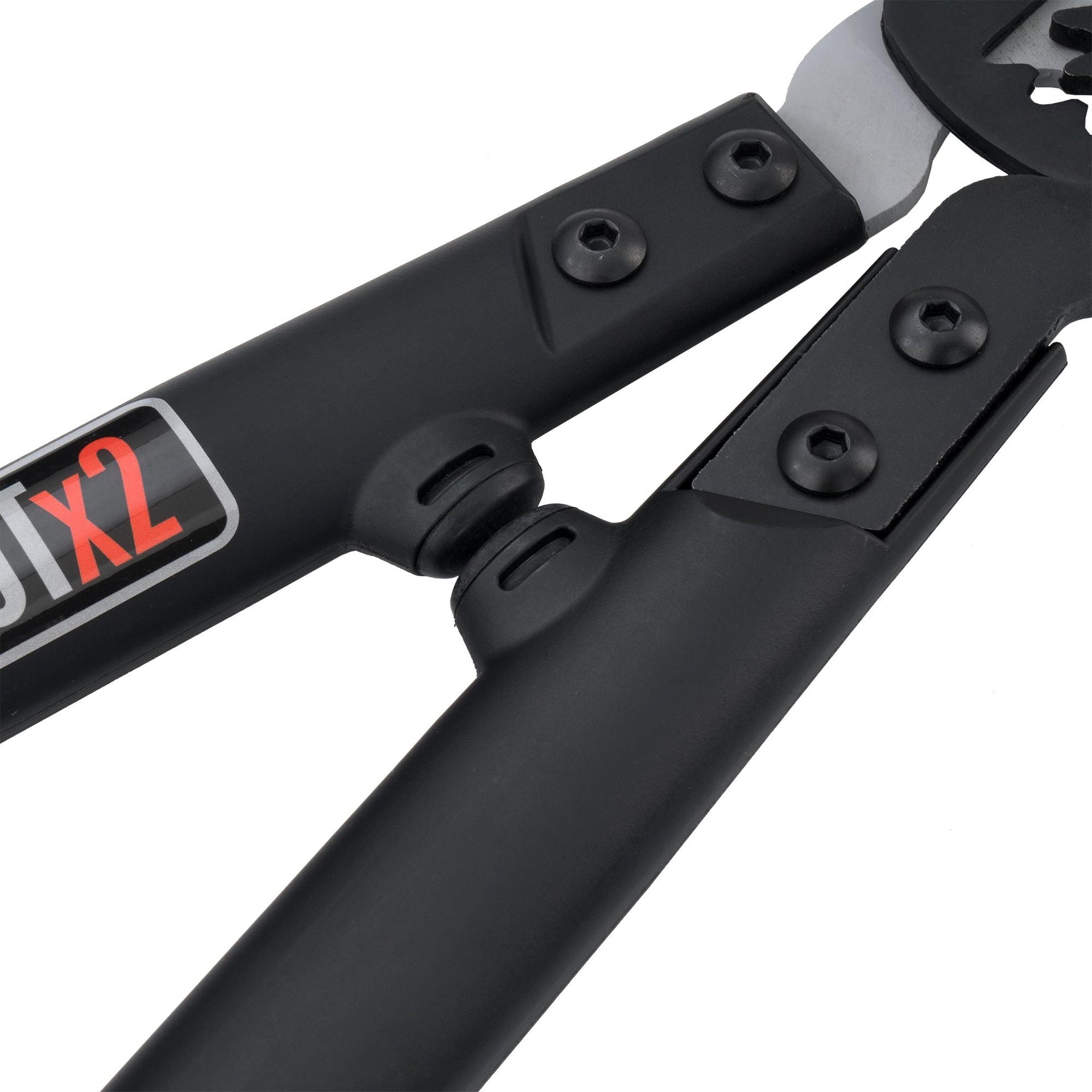 Tijera de dos manos tipo yunque con multiplicador de fuerza, ideal para poda de ramas gruesas, tanto verdes como secas, a diferentes alturas.