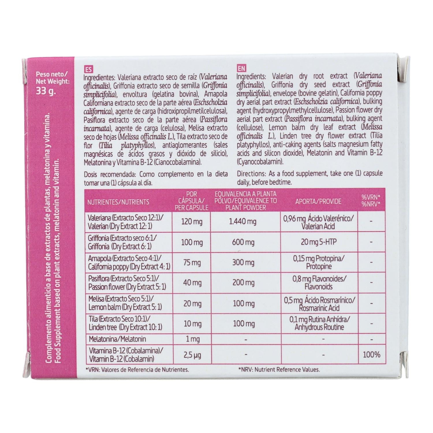 Amapola Extracto Seco 31.25 mg (Equivalente a 125 mg de Planta Polvo) (Escholtzia californica), Valeriana Extracto Seco 30 mg (Equivalente a 150 mg de Planta Polvo) (Valeriana officinalis), Griffonia Extracto Seco 25 mg (Equivalente a 150 mg de Planta Polvo) (Griffonia simplicifolia), Passiflora Extracto Seco 20 mg (Equivalente a 100 mg de Planta Polvo) (Passiflora incarnata), Melisa Extracto Seco 12,50 mg (Equivalente a 62 mg de Planta Polvo) (Melisa officinalis L\ Tila Extracto Seco 4,90 mg (Equivalente a 49 mg de Planta Polvo) (Tilia Platyphyllos scopodiet cordata Mili), Melatonina 1 mg, Adhesivo (Almidón de Maíz), Aglutinante (Maltodextrina), Endurecedor (Fosfato Cálcico Dibásico Anhidro), Antiaglomerante (Talco) y Antiaglomerantes (Estearato de Magnesio Vegetal y Dióxido de Silicio).