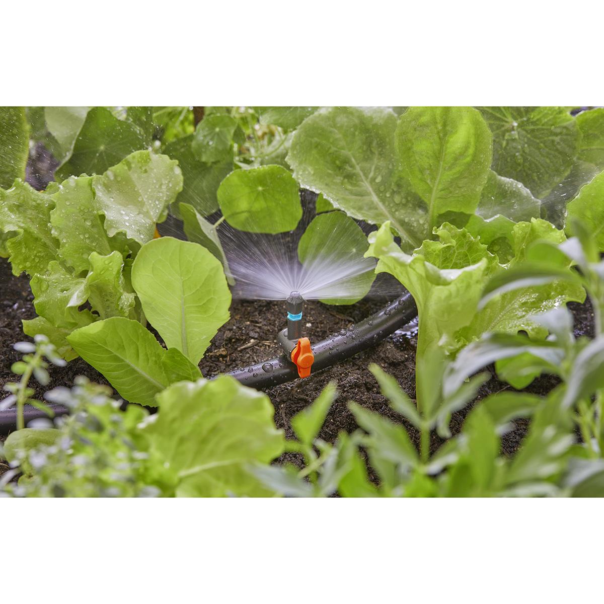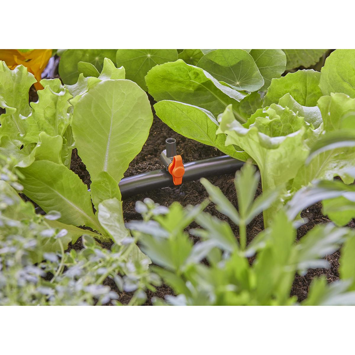 La válvula de cierre y regulación Gardena de 4.6 mm (3/16") le ofrece el máximo control sobre el flujo de agua en su sistema de riego por micro-goteo. Permite apagar o regular ramas individuales de la tubería, ajustar el alcance de las boquillas de aspersión y adaptar el caudal a las necesidades específicas de cada planta o zona de césped. Su diseño facilita la instalación y recolocación en la tubería, incluso para regar plantas elevadas con tubos de extensión.