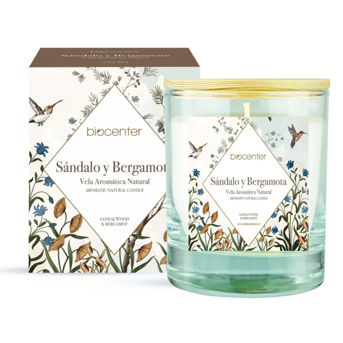 Vela aromática SÁNDALO Y BERGAMOTA.  Aroma intenso, con notas de bergamota que despiertan alegría y vitalidad, y de sándalo, que nos invitan a la aventura de seguir el propio instinto. Proporciona concentración y entusiasmo.     Las velas perfumadas Biocenter, elaboradas con una preciada mezcla de cera vegetal 100% natural y aceites esenciales, son perfectas para crear un ambiente agradable y acogedor, evocar recuerdos y experiencias, además de generarlos. Vela natural de alta duración (40 horas), en vaso de cristal de alta calidad y elegante estuche decorado.
