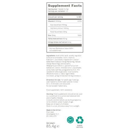 - Cada dosis contiene 500 mg de vitamina C, 8 mg de zinc, 50 mg de extracto de yerba mate y 3 mg de extracto de ginseng.