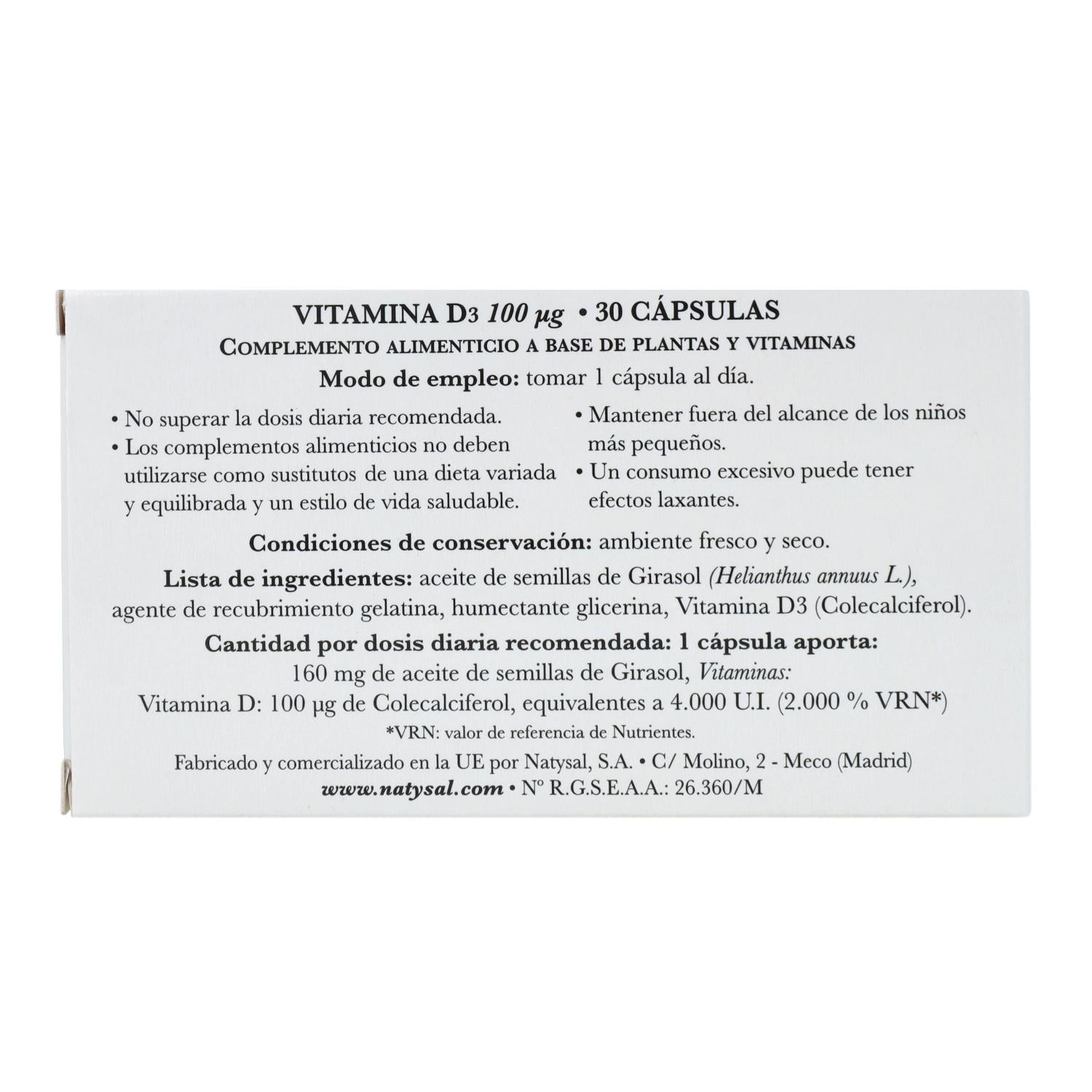 Toda la información sobre "Vitamina D3 30 Capsulas Natysal"
